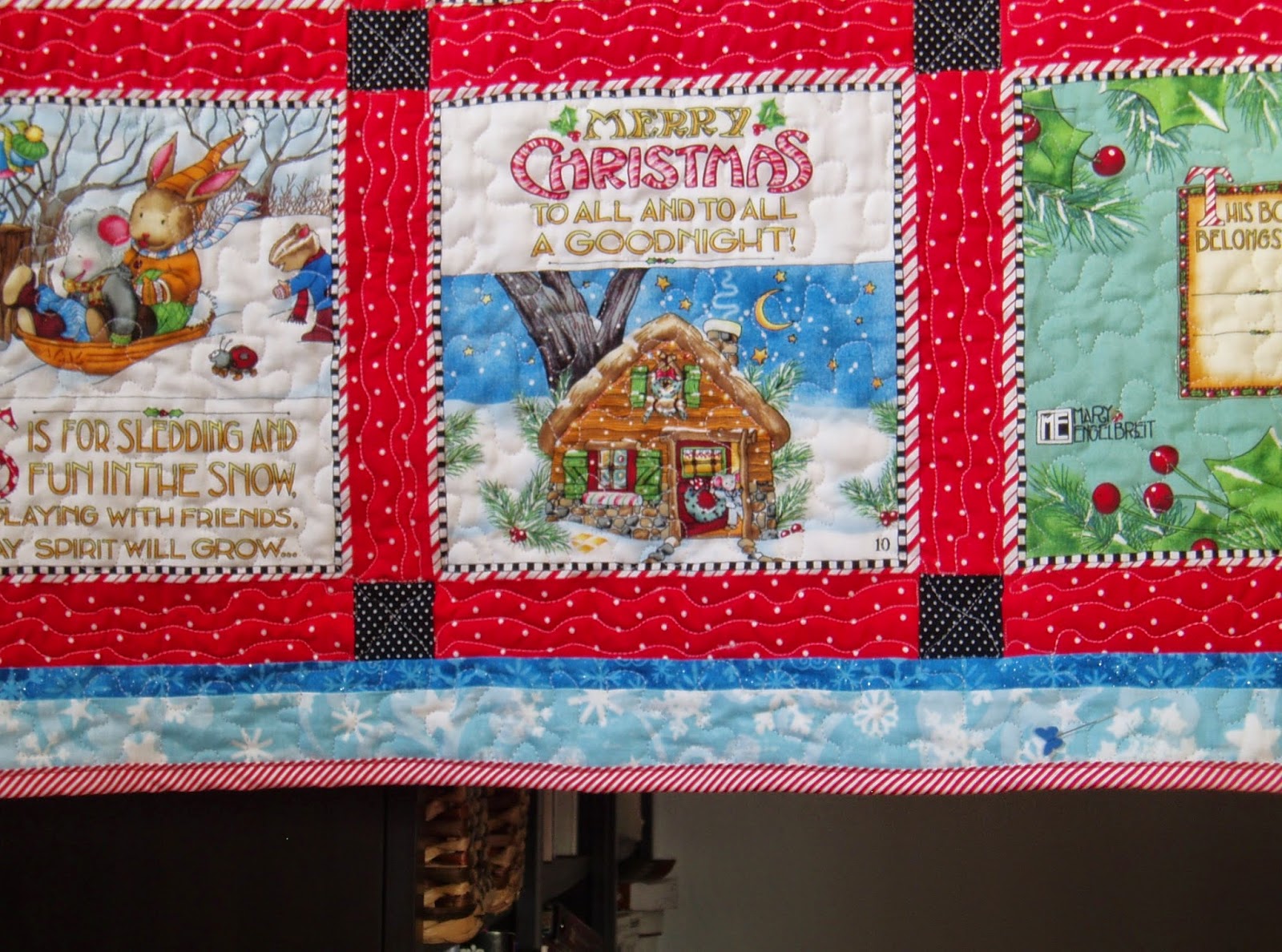 | For the quilting, I did some wavy lines in the red borders, X's in the black cornerstones, and meandering everywhere else. And I knew immediately that the binding would be candy cane stripes. |
